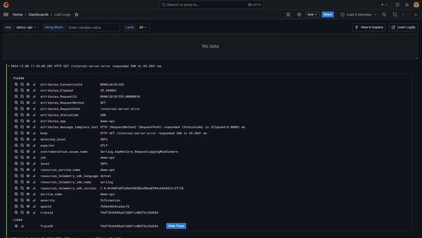 Zudem ist dank der integrierten „View Trace“-Funktion ein nahtloser Wechsel von einem Log-Eintrag zum zugehörigen Trace möglich. Dadurch wird es extrem einfach, die Kette von Ereignissen nachzuvollziehen, die zu einem bestimmten Fehler oder einer Auffälligkeit geführt hat.