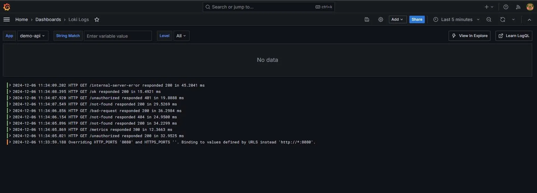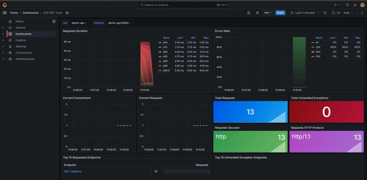 Sobald unsere Anwendung läuft und Telemetriedaten produziert, können wir Grafana nutzen, um diese Daten in aussagekräftigen Dashboards darzustellen. Wie bereits erwähnt, haben wir in der Standardkonfiguration zwei Dashboards parat: ein Dashboard für ASP.NET Core Metriken und eines für Loki Logs. Über diese Dashboards lassen sich beispielsweise Request-Dauern, Antwortcodes und aktive Requests analysieren. Werfen wir einen Blick auf ein mögliches Setup: