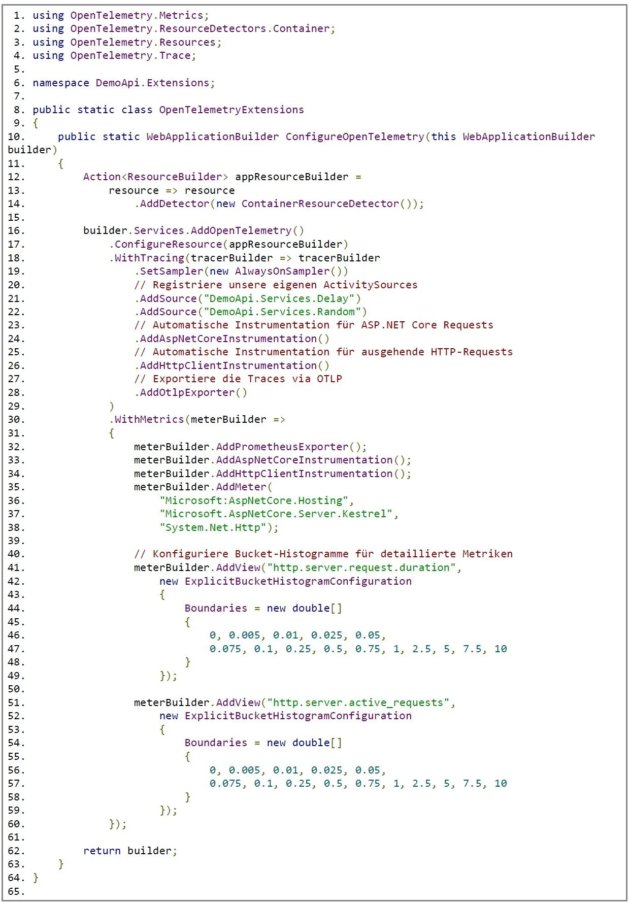 In der Klasse OpenTelemetryExtensions konfigurieren wir, welche Quellen getraced, welche Metriken erhoben und wie diese Daten exportiert werden. Mit AddAspNetCoreInstrumentation() werden alle eingehenden Requests automatisch erfasst, AddHttpClientInstrumentation() deckt ausgehende HTTP-Aufrufe ab, und AddOtlpExporter() schickt die Telemetriedaten an den OpenTelemetry Collector.