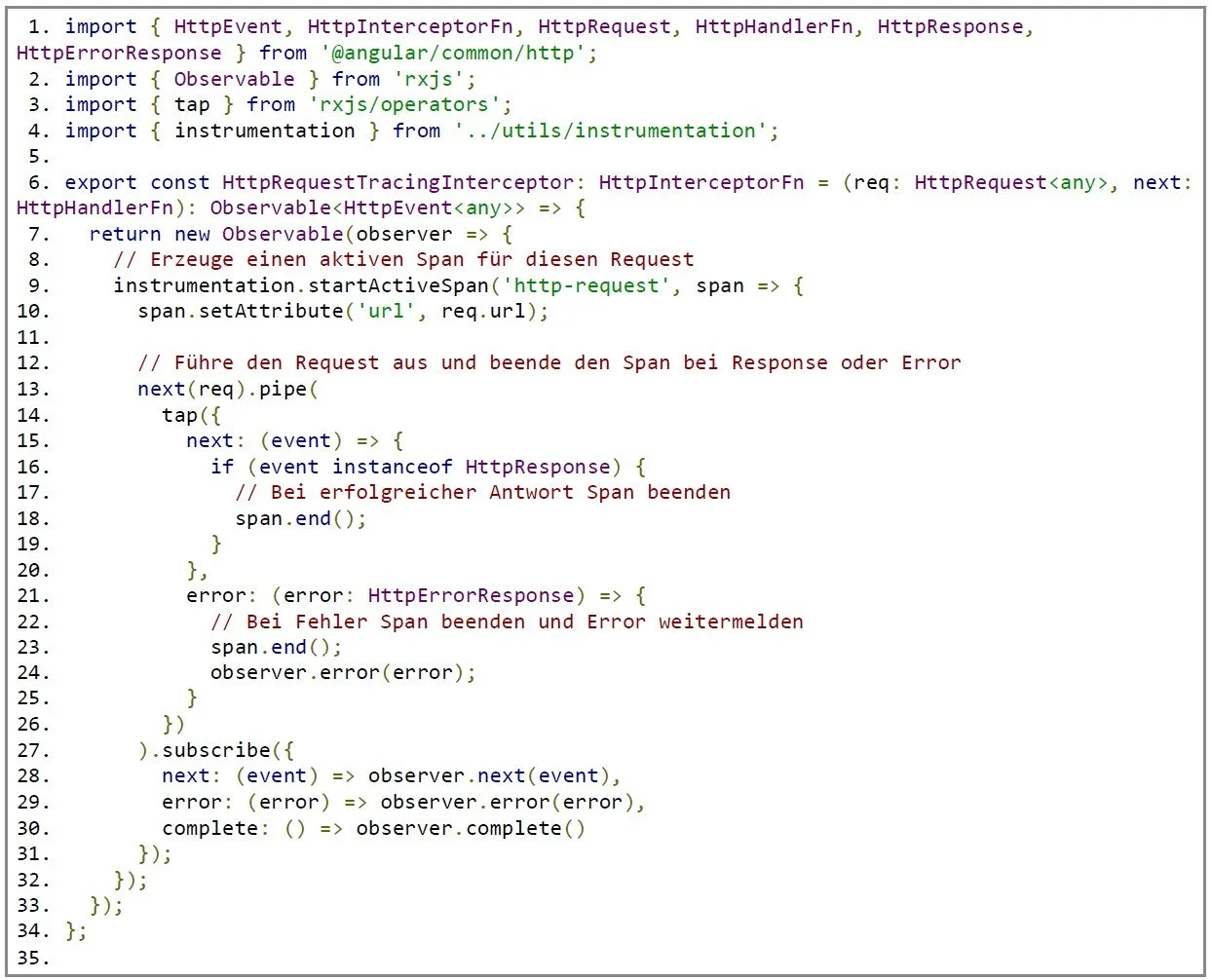 Um sicherzustellen, dass wir auch wirklich jeden Request sauber getraced bekommen und gegebenenfalls zusätzliche Attribute oder Fehlerkennzeichnungen setzen können, verwenden wir einen Angular HTTP-Interceptor. Dieser startet bei jedem Request einen neuen Span und beendet ihn, sobald die Antwort oder ein Fehler vorliegt.