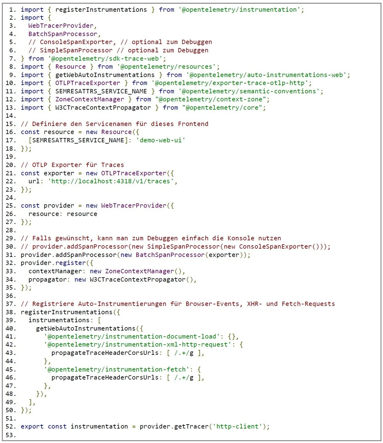 In unserer instrumentation.ts-Datei erstellen wir einen WebTracerProvider, verknüpfen ihn mit einem OTLP-Exporter, um die Traces an den OpenTelemetry Collector zu senden, und registrieren die Autoinstrumentation. Dadurch werden automatisch XML- und Fetch-Requests getraced.