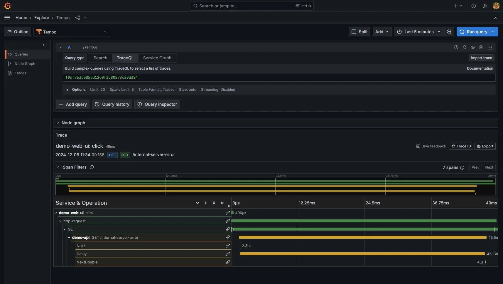 Mit einem Klick auf „View Trace“ öffnet sich die Tempo Data Source in Grafana. Hier lässt sich der komplette Trace einsehen, der zum ausgewählten Log-Eintrag gehört. Diese Darstellung zeigt ausführlich, welche Spans beteiligt waren, wie lange sie dauerten und an welcher Stelle ein Fehler auftrat. So haben wir innerhalb von Sekunden vom Aggregat der Metriken über die detaillierten Logs bis hin zur genauen Trace-Ansicht navigiert.