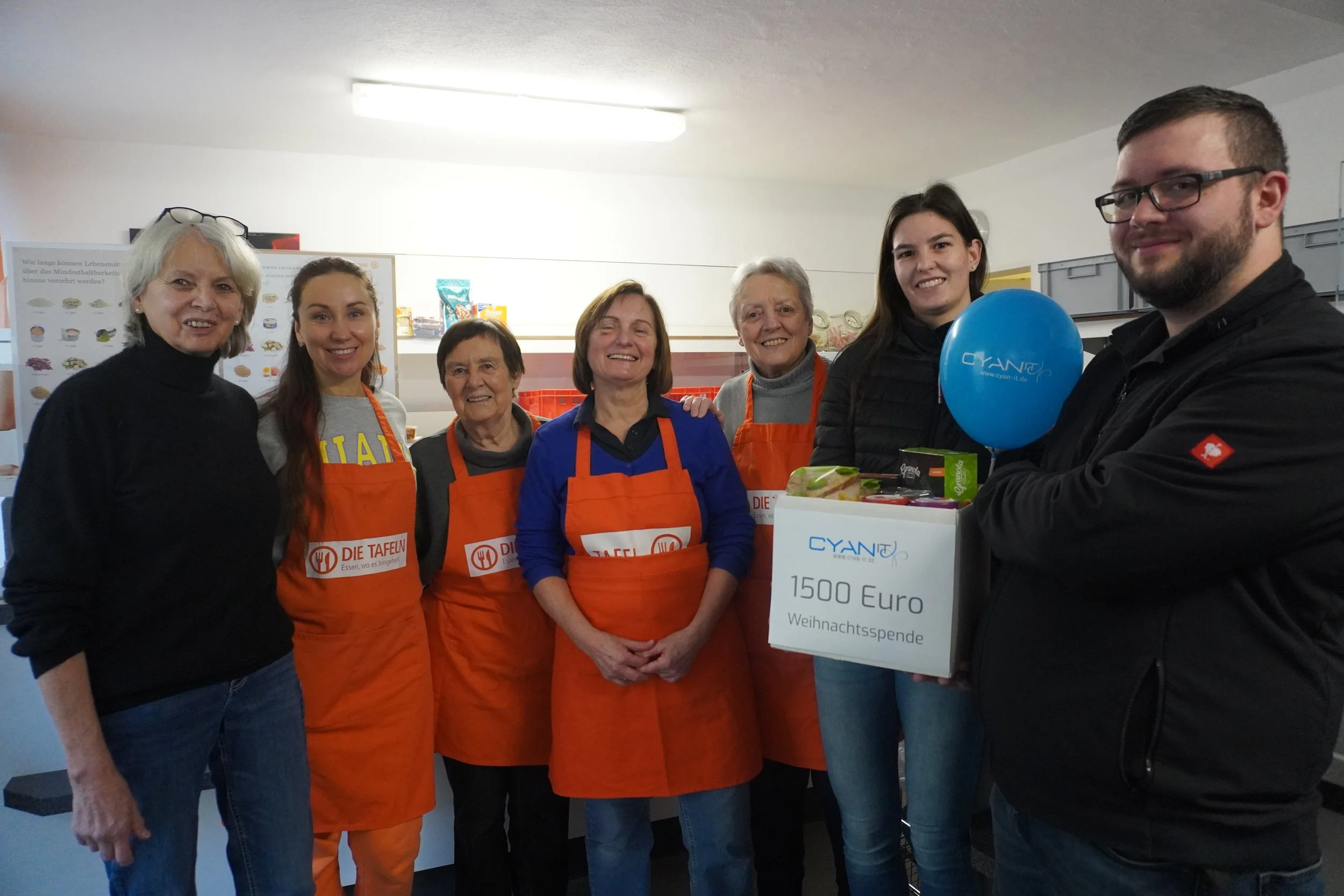 Neben der Spende übergaben Natalie und Stefan aus dem cyan.it-Team im Namen des ganzen Unternehmens ein kleines Lebensmittelpaket.